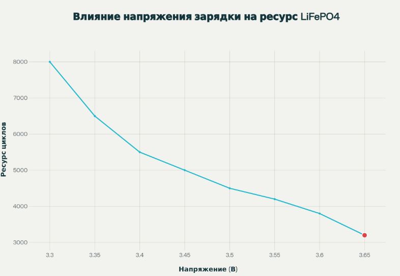 Оптимально — 3,50-3,60 В: +41% ресурсу при втраті лише 5% ємності!